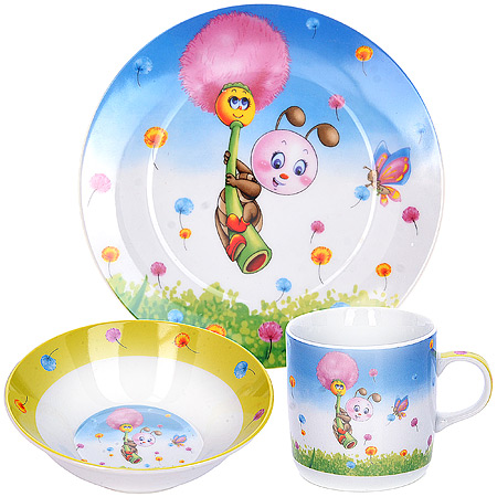 Набор деткой посуды: миска 15см, тарелка 17,5см, кружка 230мл LORAINE фарфор, Муравей LORAINE Детская посуда LR Предметы набора LORAINE выполнены из высококачественного фарфора и декорированы красочным рисунком. Изделия легкие и функциональные. Такой набор обязательно понравится вашему ребенку, потому что теперь у него будет своя собственная посуда с ярким и оригинальным рисунком. Набор посуды для детей включает в себя три предмета: суповую тарелку,