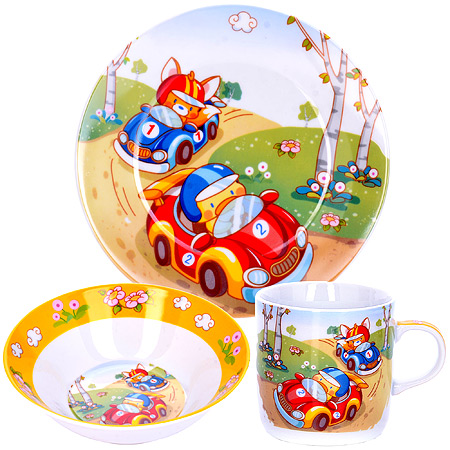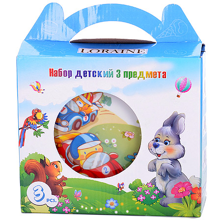 Набор деткой посуды: миска 15см, тарелка 17,5см, кружка 230мл LORAINE фарфор LORAINE Детская посуда LR Предметы набора LORAINE выполнены из высококачественного фарфора и декорированы красочным рисунком. Изделия легкие и функциональные. Такой набор обязательно понравится вашему ребенку, потому что теперь у него будет своя собственная посуда с ярким и оригинальным рисунком. Набор посуды для детей включает в себя три предмета: суповую тарелку,
