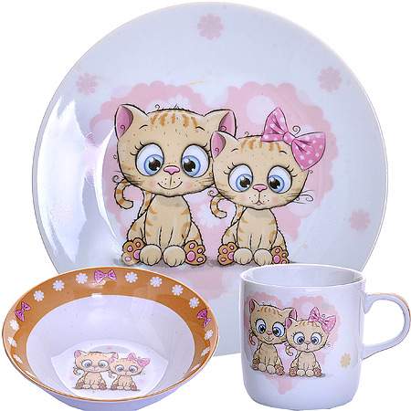 Набор детской посуды: миска 15см, тарелка 17,5, кружка 230мл LORAINE Котята, фарфор