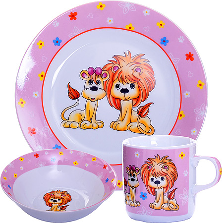 Предметы набора выполнены из высококачественной керамики и декорированы красочным рисунком. Изделия легкие и функциональные. Такой набор обязательно понравится вашему ребенку, потому что теперь у него будет своя собственная посуда с ярким и оригинальным детским рисунком. Набор посуды для детей включает в себя три предмета: суповую тарелку, обеденную тарелку и кружку. Набор упакован в красочную, подарочную упаковку. Подходит для мытья в посудомоечной машине. Для детей от 3-х лет.