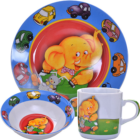 Предметы набора выполнены из высококачественной керамики и декорированы красочным рисунком. Изделия легкие и функциональные. Такой набор обязательно понравится вашему ребенку, потому что теперь у него будет своя собственная посуда с ярким и оригинальным детским рисунком. Набор посуды для детей включает в себя три предмета: суповую тарелку, обеденную тарелку и кружку. Набор упакован в красочную, подарочную упаковку. Подходит для мытья в посудомоечной машине. Для детей от 3-х лет.