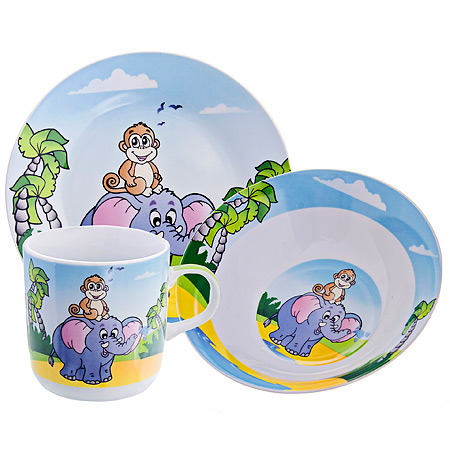 Предметы набора выполнены из высококачественного фарфора и декорированы красочным рисунком. Изделия легкие и функциональные. Такой набор обязательно понравится вашему ребенку, потому что теперь у него будет своя собственная посуда с ярким и оригинальным рисунком. Набор посуды для детей включает в себя три предмета: суповую тарелку, обеденную тарелку и кружку. Набор упакован в красочную, подарочную упаковку. Подходит для мытья в посудомоечной машине. Для детей от 4-х лет.