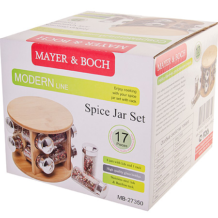 Набор для специй 100мл 17пр MAYER & BOCH стекло, бамбуковая подставка MAYER & BOCH M&B Spice Набор для специй MAYER & BOCH из высококачественного стекла идеально подходит для любой кухни. Модный, элегантный дизайн скрасит интерьер Вашей кухни. Баночки можно наполнять любыми, используемыми Вами специями. Герметичное закрытие обеспечит самое лучшее хранение. Специи всегда будут свежими. Специальная подставка делает хранение баночек еще