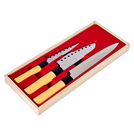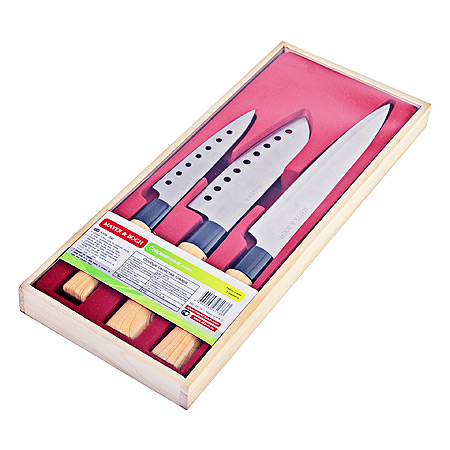 Набор MAYER & BOCH включает в себя три ножа разного размера, клинки которых изготовлены из высокоуглеродистой нержавеющей стали, обеспечивающей высокие режущие свойства кромки клинка. Сечение клинков ножей — клинообразно, что позволяет режущей кромке оставаться острой продолжительное время. Поверхность клинков легко моется, не впитывает и не «передает» запахи пищи при нарезке различных продуктов. Набор ножей идеально подойдет для резки как мяса и рыбы, так и фруктов и овощей. Тщательно разработанный дизайн рукоятки, стилизованной под дерево, и ее качество, позволяют ножу удобно располагаться в руке. Набор ножей MAYER & BOCH станет незаменимым на Вашей кухне и поможет приготовить еду быстро и вкусно. Кроме того, упакованный в красивую деревянную подарочную коробку, он станет отличным подарком Вашим друзьям и близким.