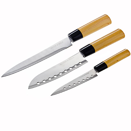 Набор ножей 3шт MAYER & BOCH из нержавеющей стали, бежевые ручки MAYER & BOCH M&B Knives Набор MAYER & BOCH включает в себя три ножа разного размера, клинки которых изготовлены из высокоуглеродистой нержавеющей стали, обеспечивающей высокие режущие свойства кромки клинка. Сечение клинков ножей — клинообразно, что позволяет режущей кромке оставаться острой продолжительное время. Поверхность клинков легко моется, не впитывает и не