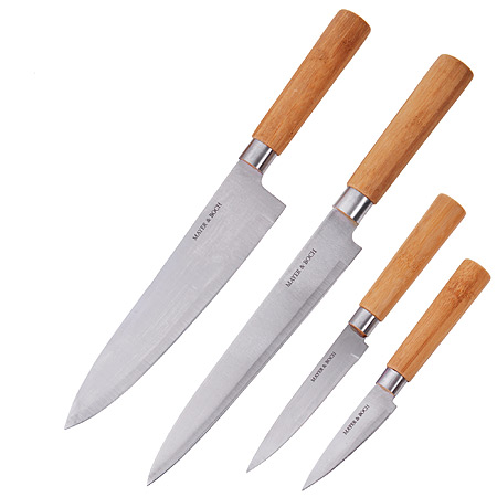 Набор ножей 4шт MAYER & BOCH из нержавеющей стали, пластиковая подставка, бамбуковые ручки MAYER & BOCH M&B Knives Набор ножей MAYER & BOCH состоит из 4-х ножей разного размера (поварского ножа, разделочного ножа и универсального ножа,нож для очистки), компактно складывающихся в оригинальную подставку-тубус из полипропилена. Лезвия выполнены из высококачественной нержавеющей стали, имеют износостойкую режущую кромку, благодаря чему ножи дольше остаются