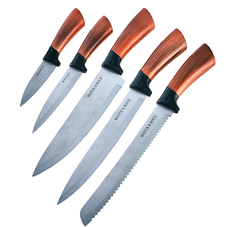 Набор ножей MAYER & BOCH состоит из 5-ти ножей разного размера, компактно складывающихся в оригинальную подставку-тубус из полипропилена. Лезвия выполнены из высококачественной нержавеющей стали, имеют износостойкую режущую кромку, благодаря чему ножи дольше остаются острыми, а эргономичные рукоятки ножей, выполненные из ПП, обеспечивают безопасную работу и комфортное положение в руке. Это прекрасные ножи для ежедневной резки фруктов, овощей и мяса. Изделия имеют гладкую, легко очищаемую поверхность. Оригинальный дизайн набора и качество исполнения не оставят Вас равнодушными. Набор MAYER & BOCH станет великолепным подарком и отлично украсит интерьер Вашей кухни!