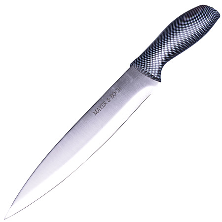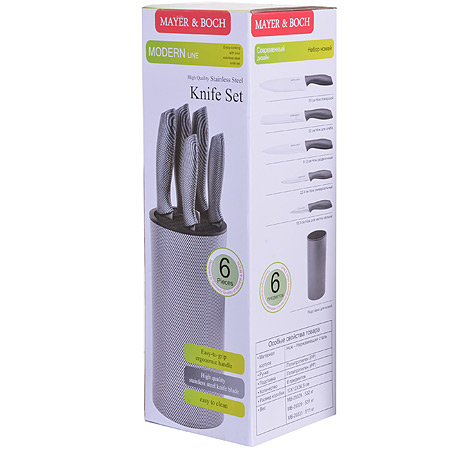 Набор ножей MAYER & BOCH состоит из 5-ти ножей разного размера (поварского ножа, разделочного ножа,для хлеба, универсального ножа и для чистки овощей), компактно складывающихся в оригинальную цветную подставку-тубус из полипропилена. Лезвия выполнены из высококачественной нержавеющей стали, имеют износостойкую режущую кромку, благодаря чему ножи дольше остаются острыми, а эргономичные рукоятки ножей, выполненные из полипропилена, обеспечивают безопасную работу и комфортное положение в руке. Это прекрасные ножи для ежедневной резки фруктов, овощей и мяса. Изделия имеют гладкую, легко очищаемую поверхность. Оригинальный дизайн набора и качество исполнения не оставят Вас равнодушными. Набор MAYER & BOCH станет великолепным подарком и отлично украсит интерьер Вашей кухни!