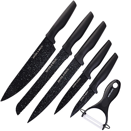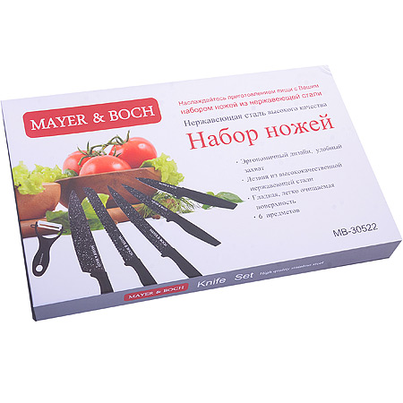 Набор ножей MAYER & BOCH состоит из 6-ти предметов. В наборе: нож для очистки, поварской, хлебный, разделочный, универсальный и нож-пиллер. Все они разных размеров с лезвиями из высококачественной нержавеющей стали станет незаменимым помощником на Вашей кухне. Ножи идеально подойдут для резки как мяса и рыбы, так и сыра, фруктов и овощей. Эргономичная рукоятка каждого изделия удобно ложится в ладонь, обеспечивая безопасную работу, комфортное положение в руке, надежный захват и не дает ножам скользить при использовании. Поверхность клинков не впитывает и не «передает» запахи пищи при параллельной нарезке различных продуктов. Не подходит для мытья в посудомоечной машине. Мыть руками в теплой воде, используя моющее средство умеренной концентрации, затем ополоснуть и вытереть насухо. При необходимости ножи рекомендуется точить. Оригинальный дизайн набора и качество исполнения не оставят Вас равнодушными!