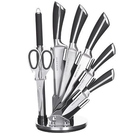 Набор: ножи 5шт, ножницы, мусат, подставка MAYER & BOCH из нержавеющей стали, черные ручки MAYER & BOCH M&B Knives Набор MAYER & BOCH включает в себя 5 ножей разного размера, мусат (ножеточку), ножницы и подставку. Лезвия ножей выполнены из высококачественной нержавеющей стали, имеют гладкую и легко очищаемую поверхность, устойчивы к повреждениям и окислению. Набор ножей идеально подойдет для резки как мяса и рыбы, так и фруктов и овощей. Прочная эргономичная