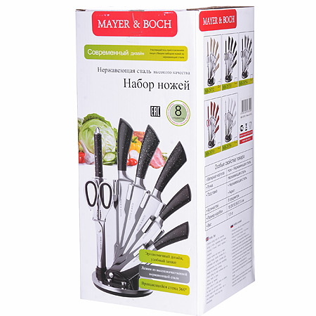 Набор MAYER & BOCH включает в себя 5 ножей разного размера, мусат (ножеточку), ножницы и подставку. Лезвия ножей выполнены из высококачественной нержавеющей стали, имеют гладкую и легко очищаемую поверхность, устойчивы к повреждениям и окислению. Набор ножей идеально подойдет для резки как мяса и рыбы, так и фруктов и овощей. Прочная эргономичная рукоятка каждого изделия, выполненная из нержавеющей стали, удобно ложится в ладонь, обеспечивая безопасную работу, комфортное положение в руке и надежный захват. Все предметы набора компактно размещаются на оригинальной прозрачной акриловой подставке-веере". Набор MAYER & BOCH включает все необходимые ножи для ежедневного приготовления пищи, а его стильный современный дизайн украсит интерьер вашей кухни. Подходит для мытья в посудомоечной машине.