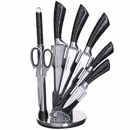Набор: ножи 5шт, ножницы, мусат, подставка MAYER & BOCH из нержавеющей стали, ручки под камень MAYER & BOCH M&B Knives Набор MAYER & BOCH включает в себя 5 ножей разного размера, мусат (ножеточку), ножницы и подставку. Лезвия ножей выполнены из высококачественной нержавеющей стали, имеют гладкую и легко очищаемую поверхность, устойчивы к повреждениям и окислению. Набор ножей идеально подойдет для резки как мяса и рыбы, так и фруктов и овощей. Прочная эргономичная
