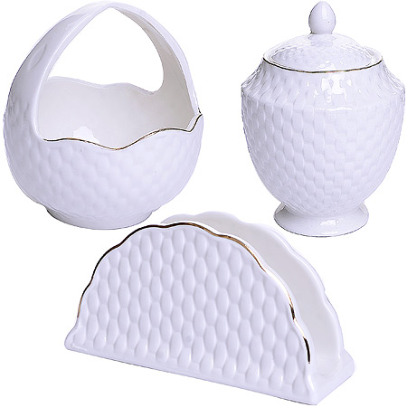 Набор состоит из сахарницы — 1 шт, вазы — 1шт, салфетницы — 1 шт. Набор посуды выполнен из фарфора. Сахарница закрывается удобной крышкой. Салфетница выполнена в виде веера, что даёт полную и стабильную опору салфеткам. Вазу можно использовать для сладостей, конфет и печенья. Такой набор понравится любителям оригинального дизайна и станет неотъемлемым атрибутом чаепития. Набор можно использовать в домашних условиях либо в общественных местах (кафе, бар, ресторан).