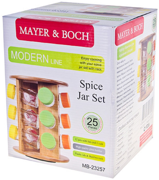 Набор для специй MAYER & BOCH стекло круглая бамбуковая подставка MAYER & BOCH M&B Spice Набор для специй MAYER&BOCH выполнен из высококачественного стекла, он идеально подходит для любой кухни. Модный, элегантный дизайн, скрасит интерьер Вашей кухни. Баночки можно наполнять любыми, используемыми Вами специями. Герметичное закрытие, обеспечит самое лучшее хранение. Специи всегда будут свежими. Специальная подставка, делает хранение