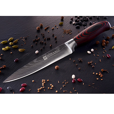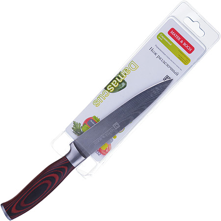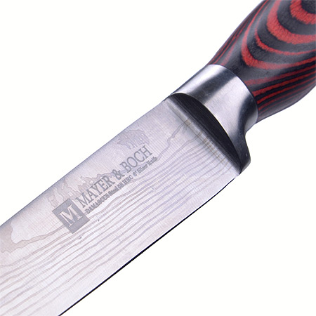 Нож разделочный 15см MAYER & BOCH Domascus дамасская сталь MAYER & BOCH M&B Knives Нож MAYER & BOCH изготовлен из высококачественной стали, обеспечивающей высокие режущие свойства кромки клинка. Нож имеет острое лезвие с ровной поверхностью и выверенным углом заточки, а также имеет специальную закалку металла для повышения прочности. Поверхность клинка легко моется, не впитывает и не «передает» запахи пищи при нарезке продуктов.