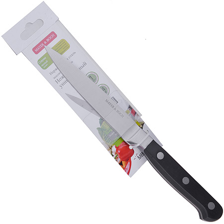 Нож универсальный кованный 12см MAYER & BOCH из нержавеющей стали MAYER & BOCH M&B Knives Нож MAYER & BOCH с лезвием из высококачественной нержавеющей стали станет незаменимым помощником на Вашей кухне. Сечение ножа — клинообразно, что позволяет режущей кромке клинка быть продолжительное время острой. Поверхность клинка легко моется, не впитывает и не «передает» запахи пищи при нарезке различных продуктов. Эргономичная рукоятка ножа