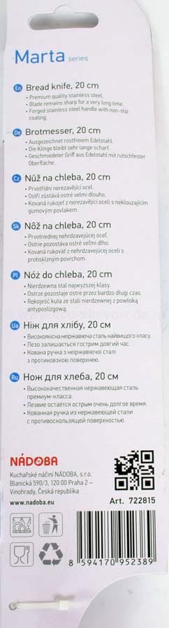 Нож для хлеба, 20см, NADOBA Marta из нержавеющей стали, Чехия Nadoba Marta Чешская компания NADOBA является эксклюзивным представителем в Восточной Европе компании Kurcharske nacini NADOBA, s.r.o. Компания NADOBA - это производитель высококачественных кухонных товаров для профессионального и домашнего использования. Компания NADOBA использует только экологичные материалы, соответствующие строгим европейским