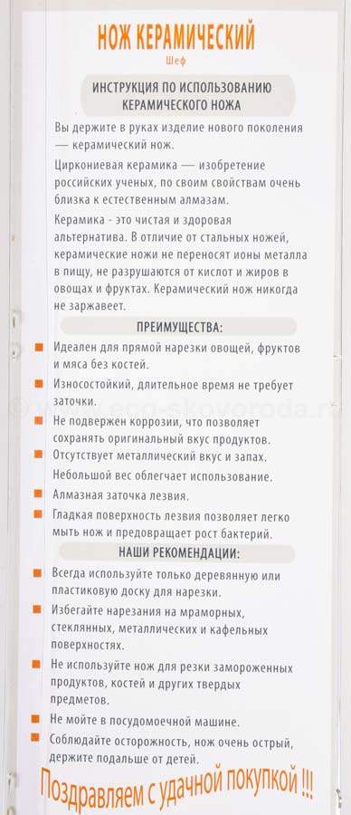 • Заточка ножа возможно только в промышленных условиях, либо при использовании точилки, специально разработанной для заточки керамических ножей.