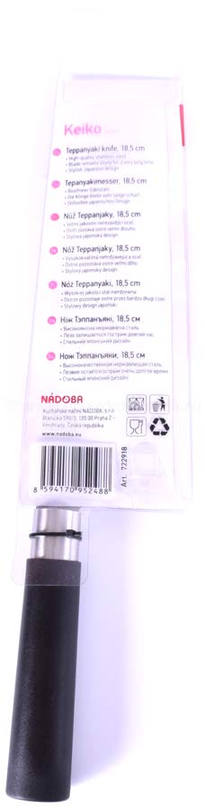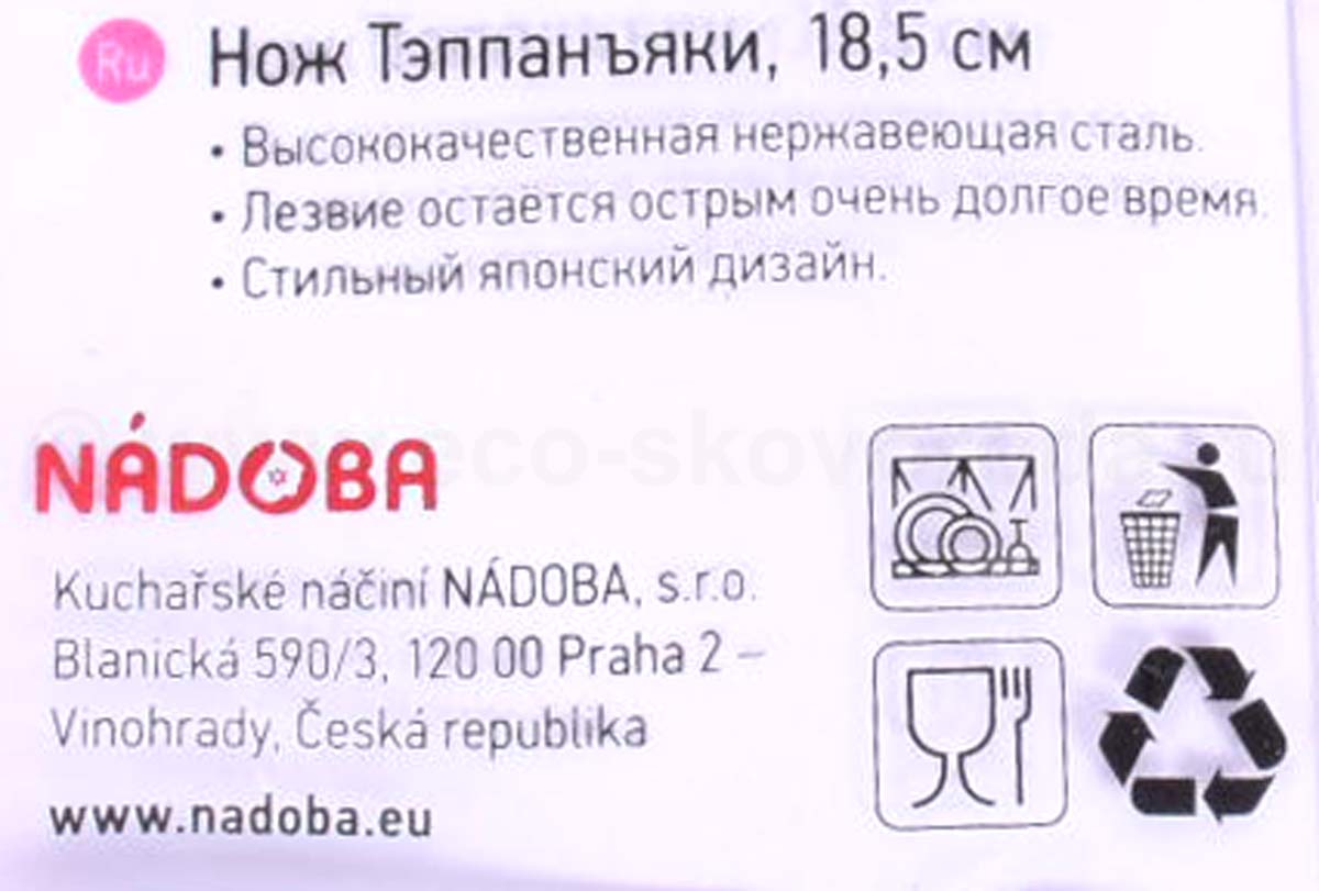 Нож Тэппанъяки 18,5см NADOBA Keiko из нержавеющей стали, Чехия Nadoba Keiko Чешская компания NADOBA является эксклюзивным представителем в Восточной Европе компании Kurcharske nacini NADOBA, s.r.o. Компания NADOBA - это производитель высококачественных кухонных товаров для профессионального и домашнего использования. Компания NADOBA использует только экологичные материалы, соответствующие строгим европейским