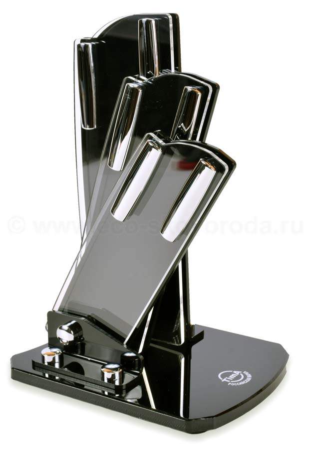 Подставка с черным основание и прозрачным держателем для ножей. Внутри подставки видно лезвие ножа.