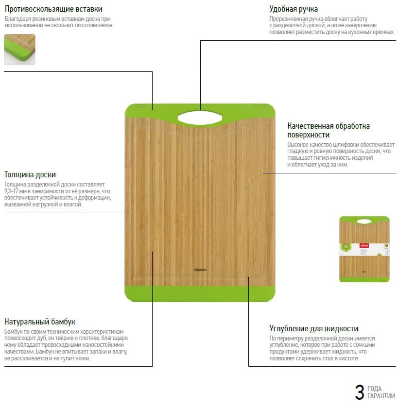 • Разделочные доски из натурального бамбука. Бамбук тверже и прочнее дуба, обладает превосходными износостойкими качествами. Не впитывает влагу и запахи, не расслаивается и не тупит ножи.