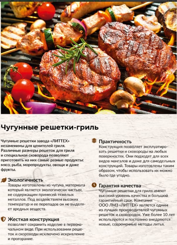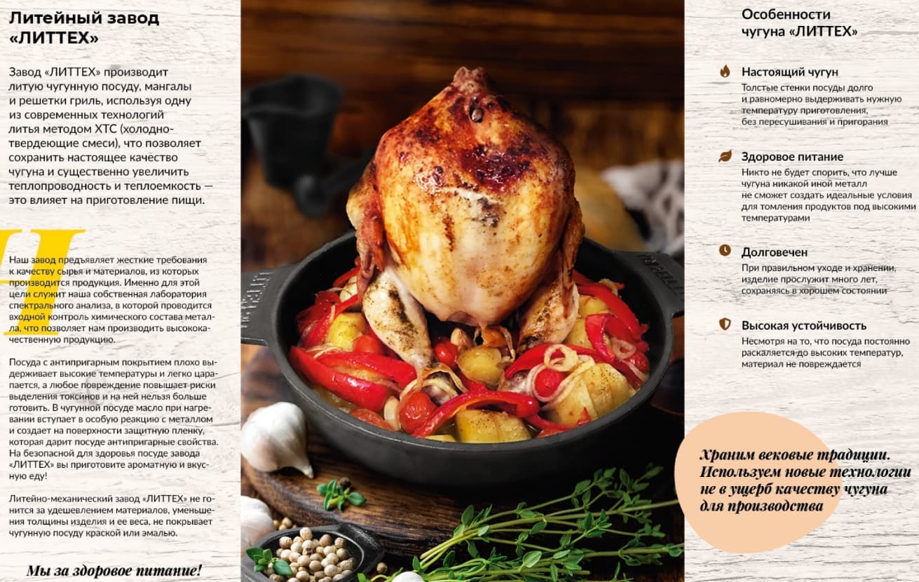 Завод ЛИТТЕХ производит литую чугунную посуду, мангалы и решетки-гриль, используя современную технологию литья методом ХТС (холодно-твердеющие смеси). Это позволило сохранить настоящее качество чугуна и существенно увеличить теплоемкость и теплопроводность, что положительно влияет на приготовление.