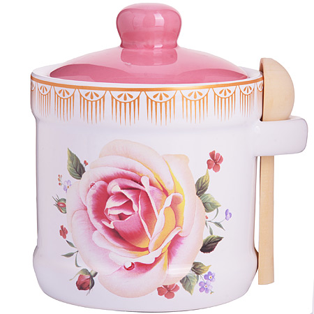 Сахарница с деревянной ложкой 480мл LORAINE Нежность доломит LORAINE Банки для сыпучих LR Сахарница LORAINE изготовлена из доломитовой керамики высокого качества и украшена красивым цветочным рисунком. Сахарница закрывается удобной крышкой розового цвета. В комплекте — небольшая деревянная ложечка. Такая сахарница понравится любителям яркого оригинального дизайна и станет неотъемлемым атрибутом чаепития. Сахарница упакована в