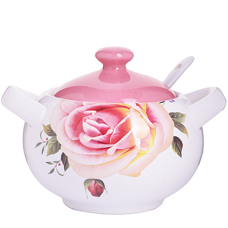 Сахарница с ложкой 375мл LORAINE Нежность доломит LORAINE Банки для сыпучих LR Сахарница LORAINE изготовлена из доломитовой керамики высокого качества и украшена красивым рисунком с изображением роз. Сахарница закрывается удобной крышкой розового цвета. В комплекте — небольшая керамическая ложечка. Сахарница оснащена двумя удобными ручками. Такая сахарница понравится любителям яркого оригинального дизайна и станет