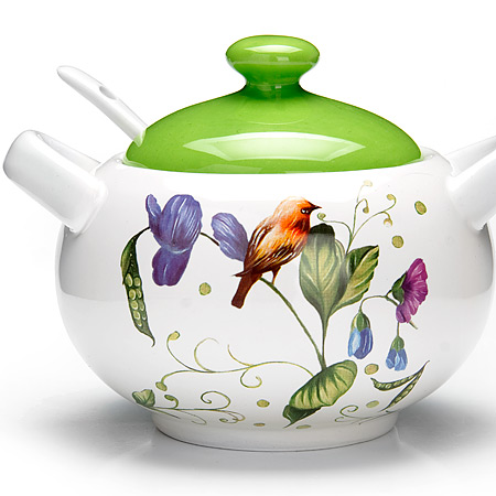 Сахарница с ложкой 375мл LORAINE Птичка доломит LORAINE Банки для сыпучих LR Сахарница LORAINE изготовлена из прочной доломитовой керамики высокого качества c цветным рисунком. Сахарница закрывается удобной крышкой. В комплекте идет небольшая керамическая ложечка. Такая сахарница понравится любителям яркого оригинального дизайна и станет неотъемлемым атрибутом чаепития. Предметы набора можно мыть в посудомоечной машине. Не