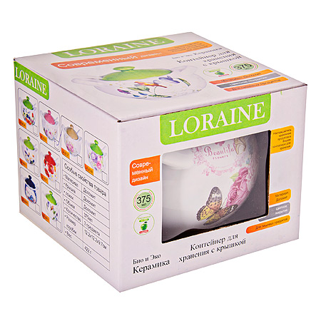 Сахарница LORAINE изготовлена из прочной керамики высокого качества c цветным рисунком. Сахарница закрывается удобной крышкой. В комплекте идет небольшая керамическая ложечка. Такая сахарница понравится любителям яркого оригинального дизайна и станет неотъемлемым атрибутом чаепития. Предметы набора можно мыть в посудомоечной машине. Не применять абразивные моющие средства.  Объем: 375 мл. Размер: 12,2 х 12,2 х 9,7 см.