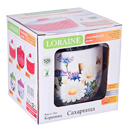 Сахарница с ложкой 520мл LORAINE Лето доломит LORAINE Банки для сыпучих LR Сахарница LORAINE изготовлена из прочной доломитовой керамики высокого качества c цветным рисунком. Сахарница закрывается удобной крышкой. В комплекте идет небольшая керамическая ложечка. Такая сахарница понравится любителям яркого оригинального дизайна и станет неотъемлемым атрибутом чаепития. Предметы набора можно мыть в посудомоечной машине. Не