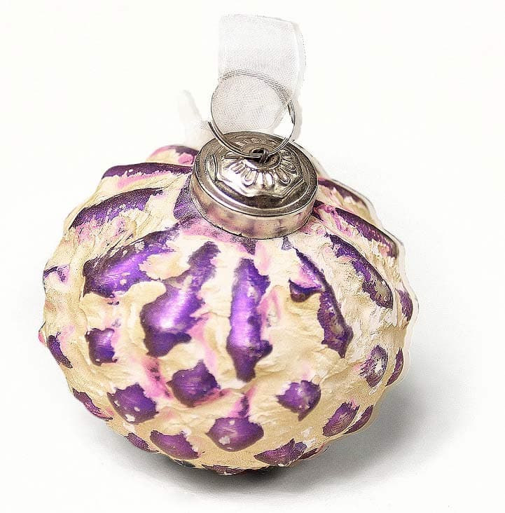 Стеклянный шарик на елку, произведенный вручную с применением крафтовой техники нанесения извести на стекло и последующей полировки изделия.