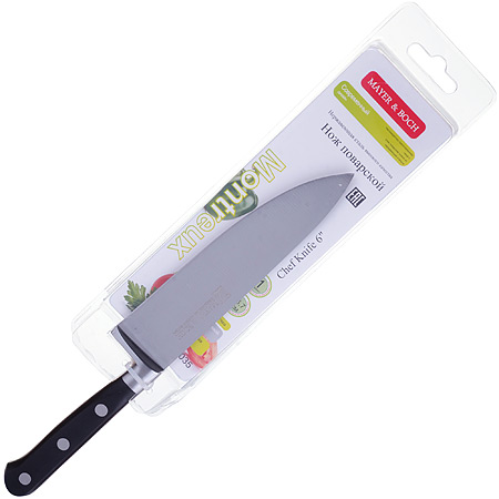 Шеф нож поварской 15,2см MAYER & BOCH Montreux из нержавеющей стали MAYER & BOCH M&B Knives Нож MAYER & BOCH с лезвием из высококачественной нержавеющей стали станет незаменимым помощником на Вашей кухне. Сечение ножа — клинообразно, что позволяет режущей кромке клинка быть продолжительное время острой. Поверхность клинка легко моется, не впитывает и не «передает» запахи пищи при нарезке различных продуктов. Эргономичная рукоятка ножа