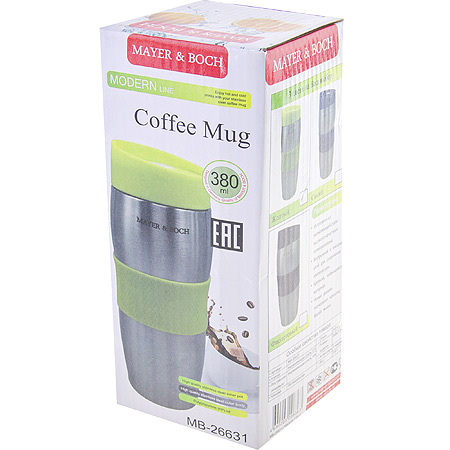Термокружка «MAYER & BOCH» изготовлена из нержавеющей стали, не содержащей токсичных веществ. Двойные стенки дольше сохраняют напиток горячим и не обжигают руки. Надежная крышка с защитой от проливания обеспечит дополнительную безопасность. Крышка оснащена клапаном для питья. Основание имеет силикованную вставку для предотвращения скольжения по поверхности. Оптимальный объем термокружки позволит взять с собой большую порцию горячего кофе или чая. Идеально подходит как для горячих, так и для холодных напитков. Такая кружка может быть использована во время отдыха, на работе, в путешествии, во время поездок в автомобиле. Объем: 380 мл.