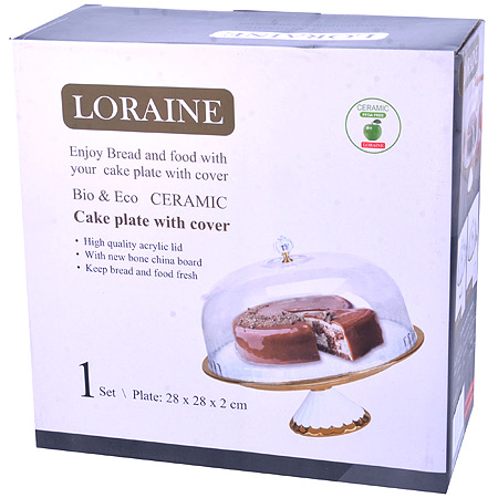 Тортовница LORAINE выполнена из фарфора с прозрачной пластиковой крышкой. Великолепная и изящная модель, которая станет превосходным дополнением, как для вашего повседневного стола, так и праздничной сервировки. Широкое, плоское блюдо позволит красиво подать выпечки, сладости, небольшие закуски и конечно торты. Отличным дополнением посуды является