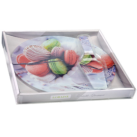 Тортовница с лопаткой LORAINE выполнена из качественного закаленного стекла и украшена ярким рисунком. Изделие идеально подойдет для сервировки не только торта и десертов, но и различных закусок. Оригинальная и стильная тортовница станет достойным украшением вашего праздничного стола. Посуда обладает непористой поверхностью и не впитывает запахи. Легко и быстро моется.