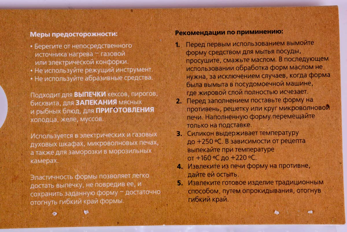Силикон обладает естественными антипригарными свойствами, поэтому нет необходимости смазывать формы маслом. Перед использованием достаточно сбрызнуть водой. И в отличии от металлической посуды, силикон не взаимодействует с продуктами и оставляет естественный вкус продуктов.