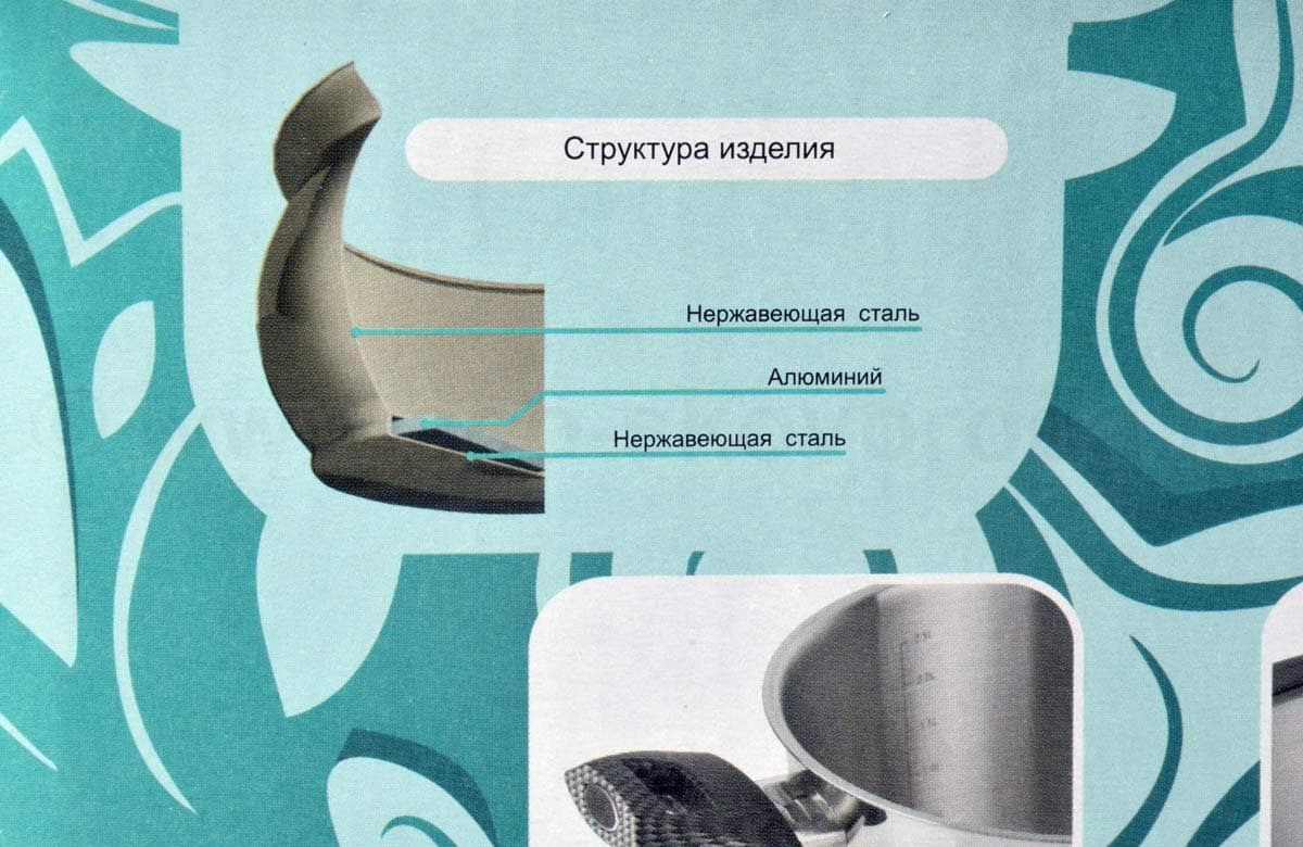 - Кастрюли изготавливаются с трехслойным аккумулирующим дном. В дно встроен алюминиевый диск, который хорошо проводит тепло;