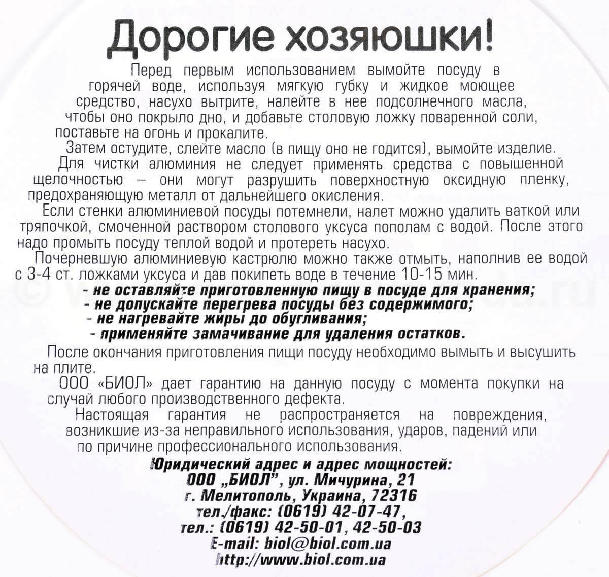 ООО “БИОЛ” дает гарантию на данную посуду с момента покупки на случай любого производственного дефекта.