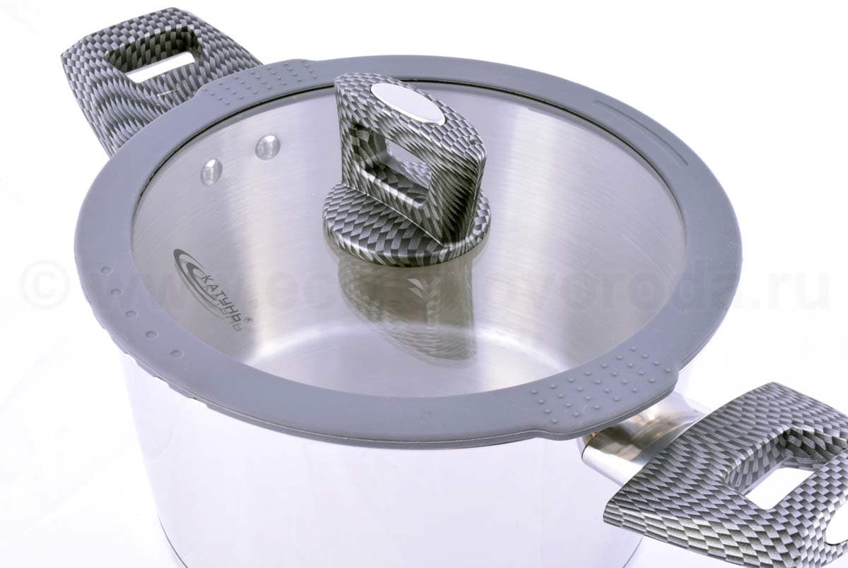 Ручки кастрюли покрыты силиконовыми накладками для защиты рук.