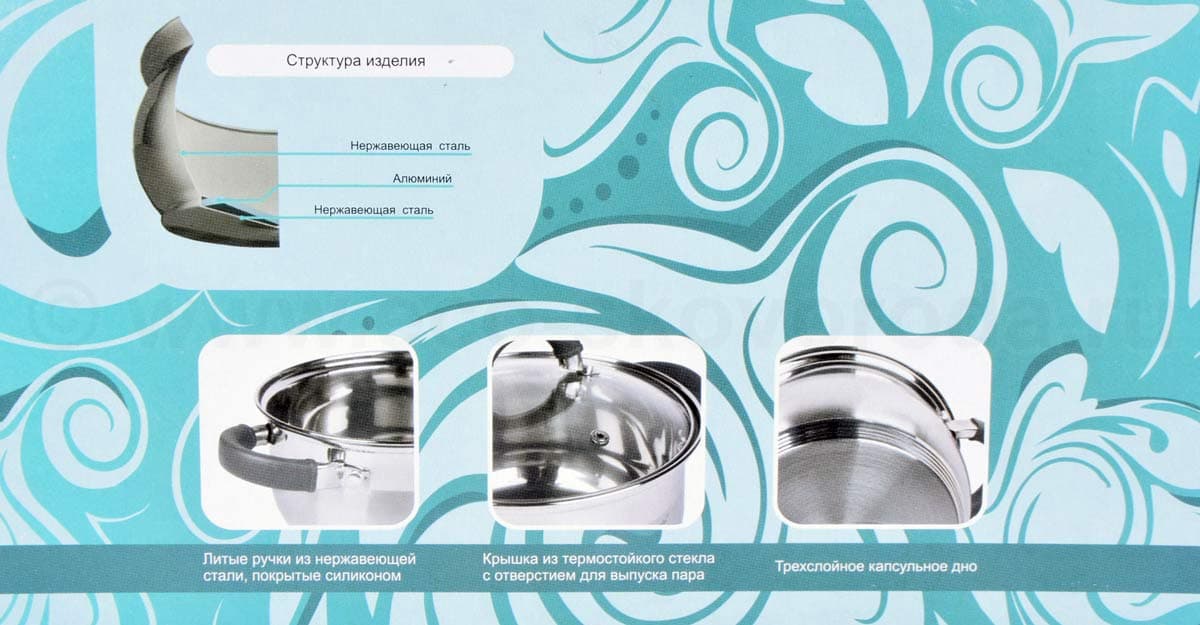• Кастрюли изготавливаются с трехслойным аккумулирующим дном. В дно встроен алюминиевый диск, который хорошо проводит тепло;