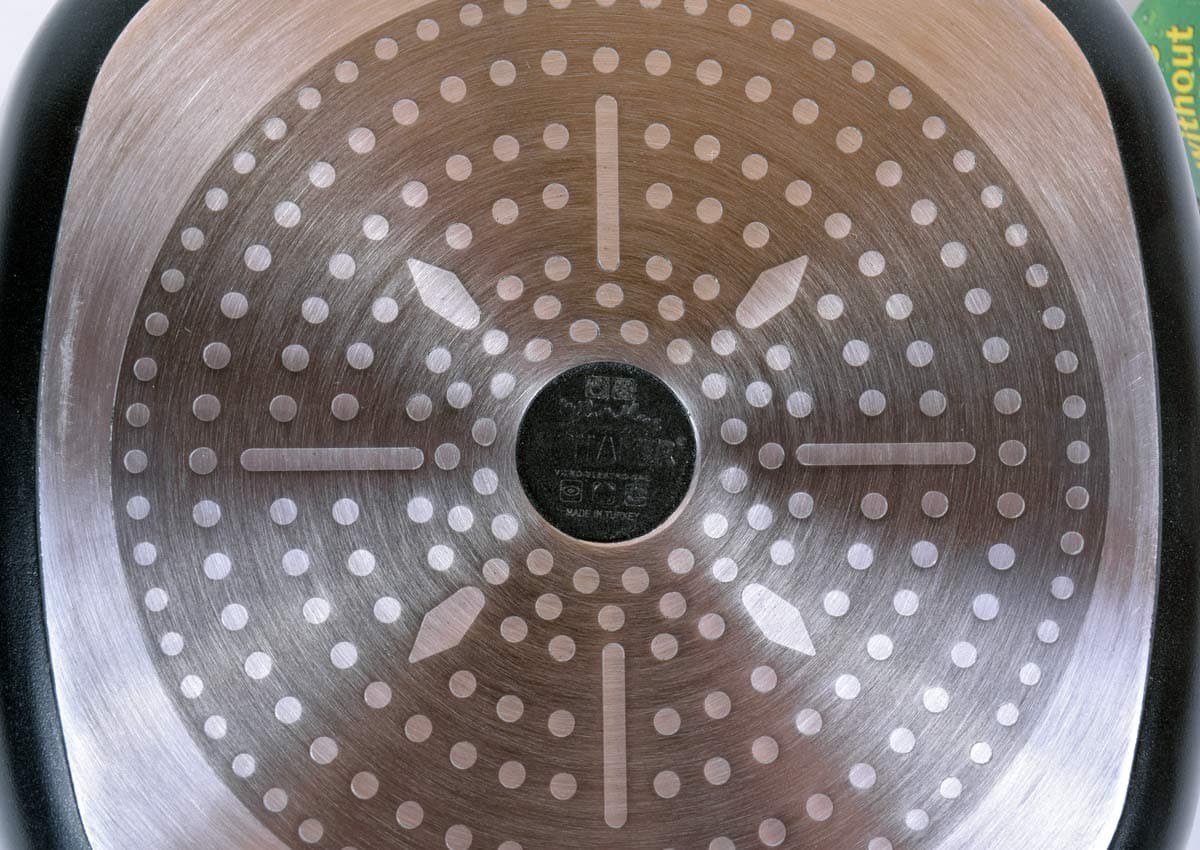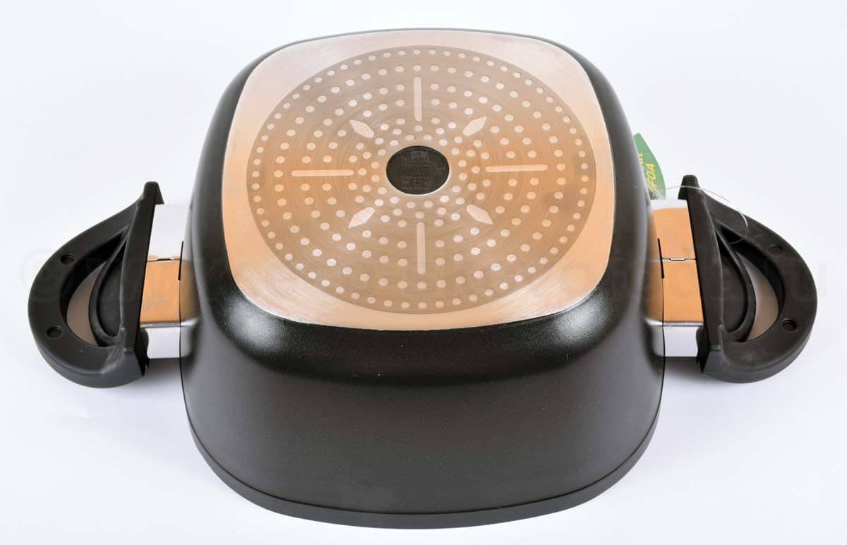 Утолщенное дно уберегает продукты от сгорания, дает более равномерное распределение тепла, прогрев посуды, аккумулирует тепло и не дает пище остывать долгое время. При таком подходе Вы можете выключать плиту заранее, а пища дойдет естественным способом и ее не надо разогревать несколько раз. Таким образом достигается экономия электроэнергии.