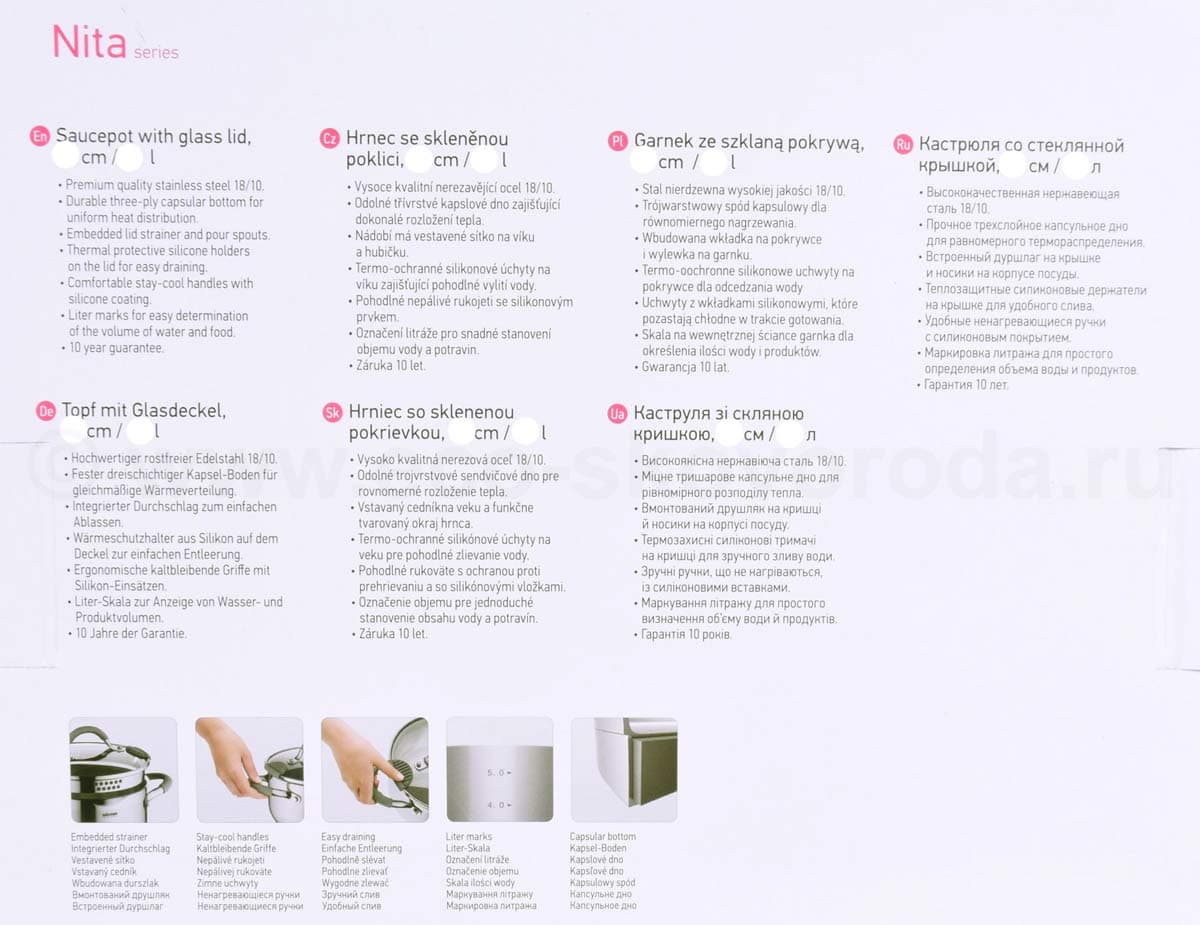 - 10 лет гарантии на посуду из нержавеющей стали серии Nita от NADOBA.