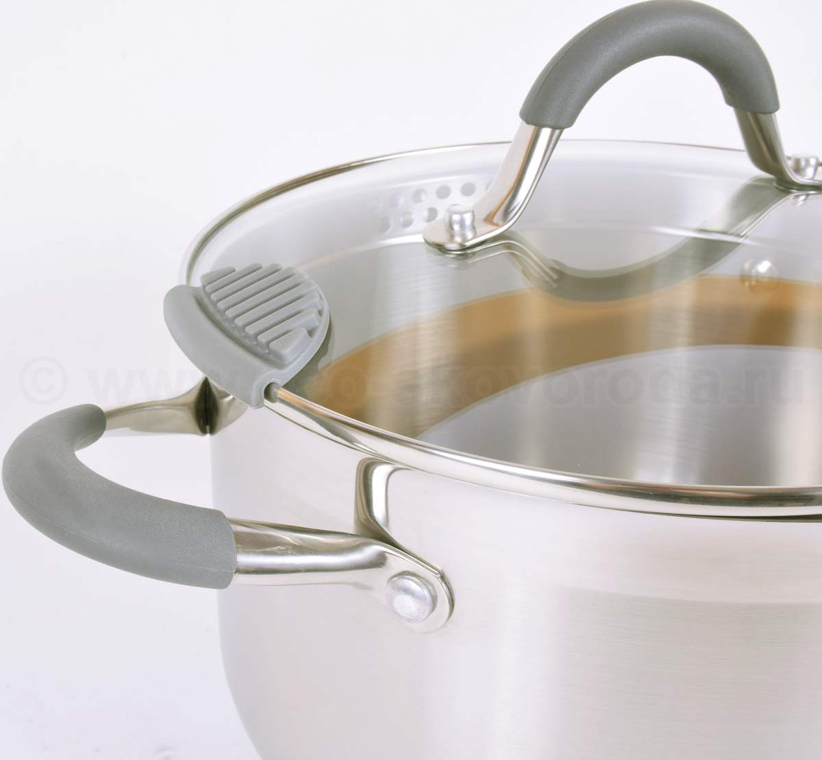 - Силиконовые держатели позволят придерживать горячую крышку во время слива жидкости.