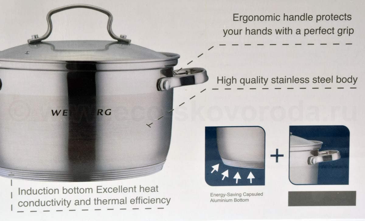 Утолщенное дно уберегает продукты от сгорания, дает более равномерное распределение тепла, прогрев посуды, аккумулирует тепло и не дает пище остывать долгое время. При таком подходе Вы можете выключать плиту заранее, а пища дойдет естественным способом и ее не надо разогревать несколько раз. Таким образом достигается экономия электроэнергии.