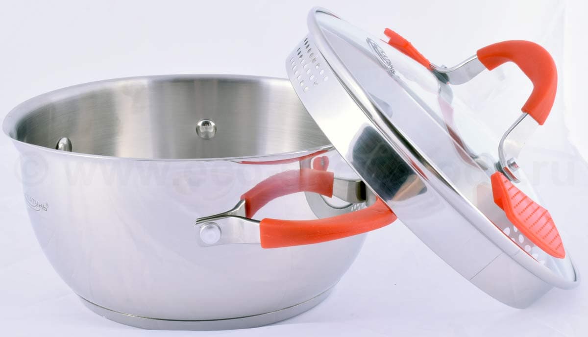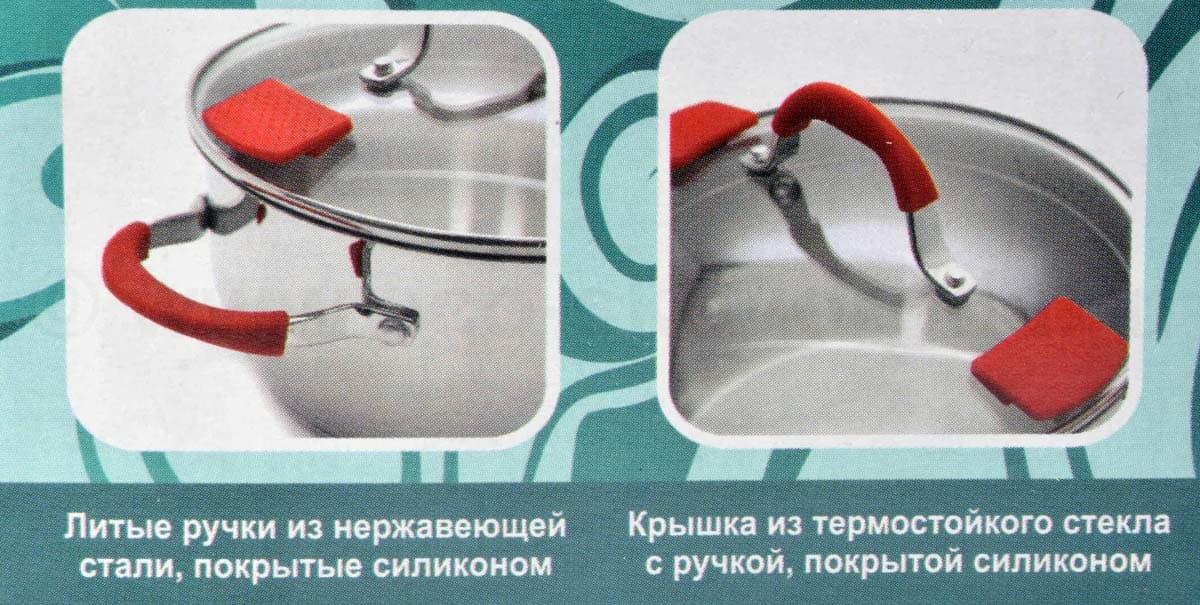Ручки кастрюли покрыты красными силиконовыми накладками для защиты рук.
