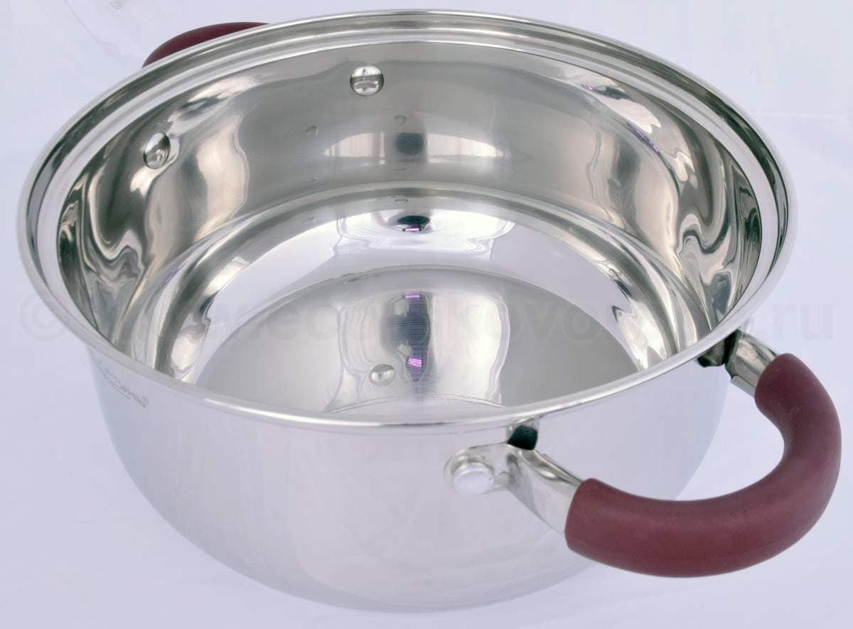 - Кастрюли изготавливаются с трехслойным аккумулирующим дном. В дно встроен алюминиевый диск, который хорошо проводит тепло;