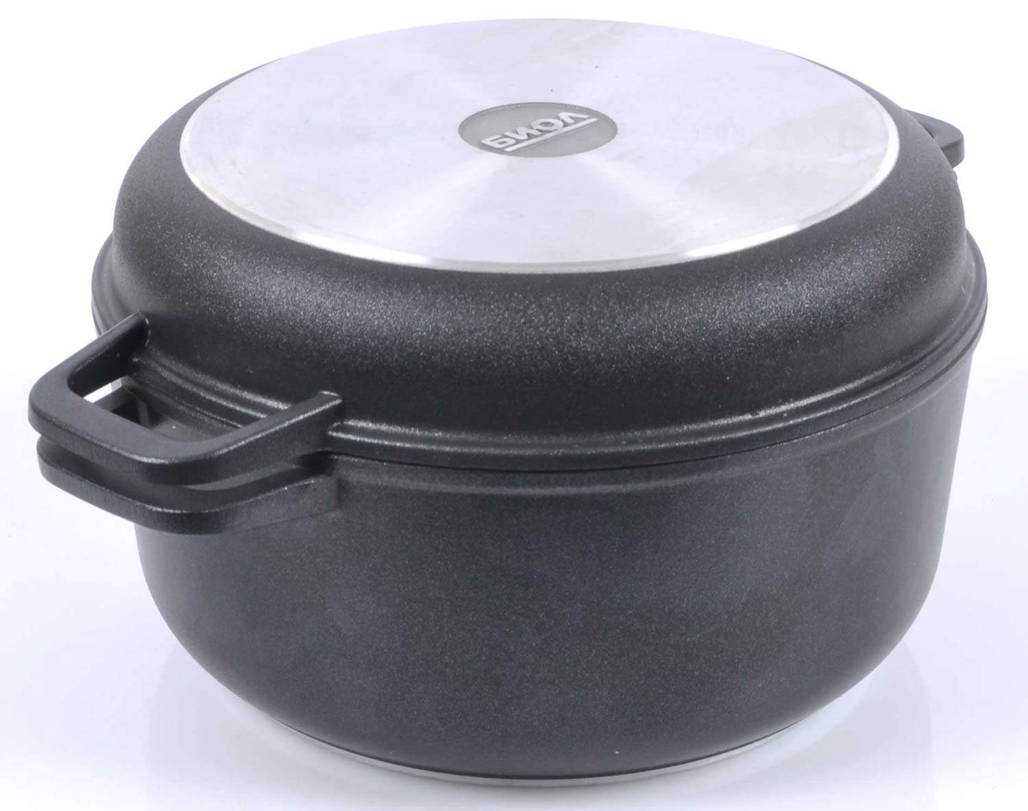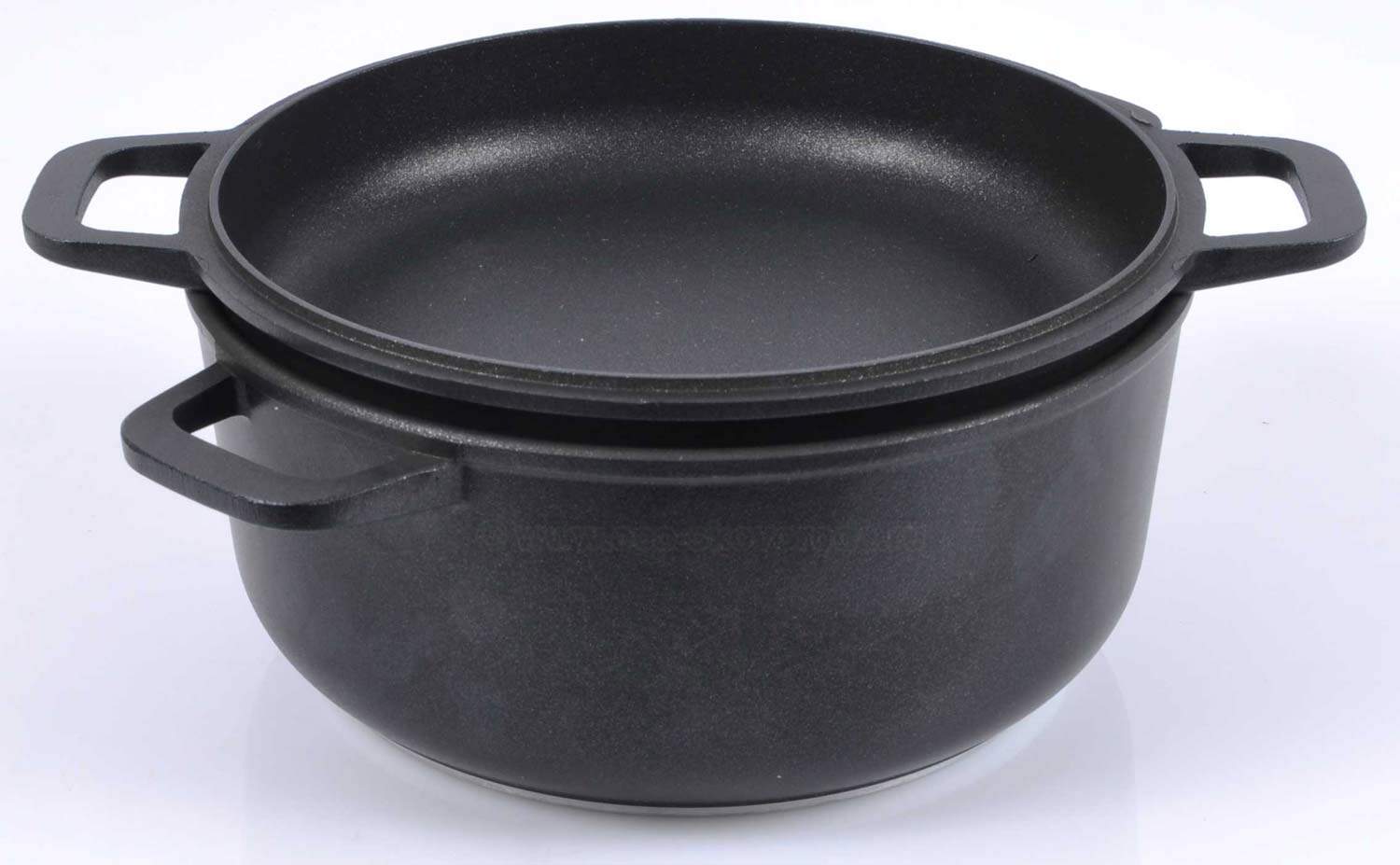 Рады предоставить Вашему внимаю кастрюли Биол в комплекте с крышкой-сковородой. Кастрюли выполнены из литого алюминия, что будет положительно сказываться на теплопроводности посуды, а толщина до 6 миллиметров на сохранения тепла длительное время. Цвет кастрюли черный внутри и снаружи - ухаживать за такими предметами будет очень легко. На дне расположен логотип компании производителя.