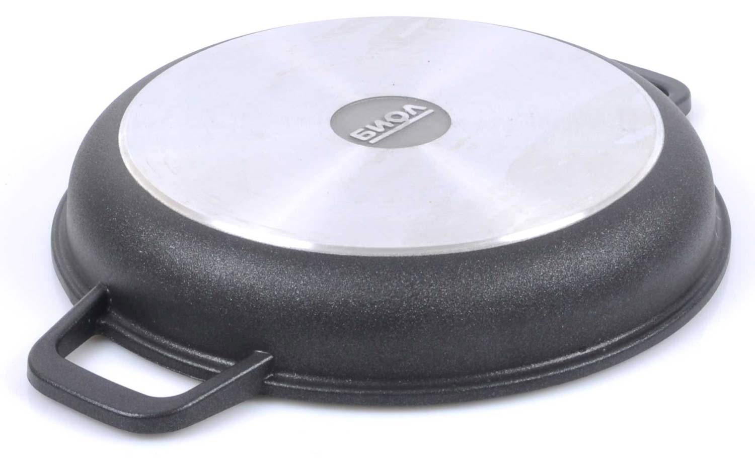 Благодаря толстому дну пища прогревается наиболее равномерно. У Вас не будет ситуаций, как с тонким дном, когда при жарке большого куска мяса поверхность куска уже подгорает, а внутри мясо еще сырое. Утолщенное дно является фильтром от больших и резких поступлений тепла, медленно аккумулирует его и равномерно передает в пищу.