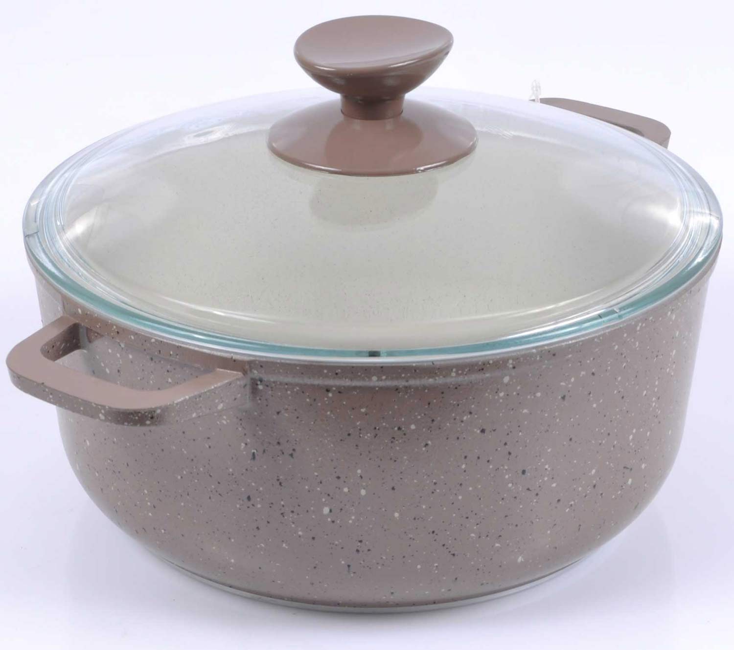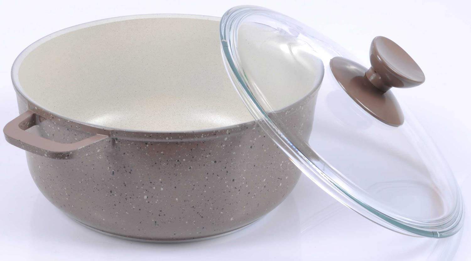 Стеклянная крышка сделана из боросиликатного стекла, прочная, не боится высоких температур. Ручка крышки коричневого цвета имеет оригинальную форму желоба, за счет чего Вы сможете хранить лопатку прямо на крышке, не оставляя ее на столе и избегая жирных пятен.